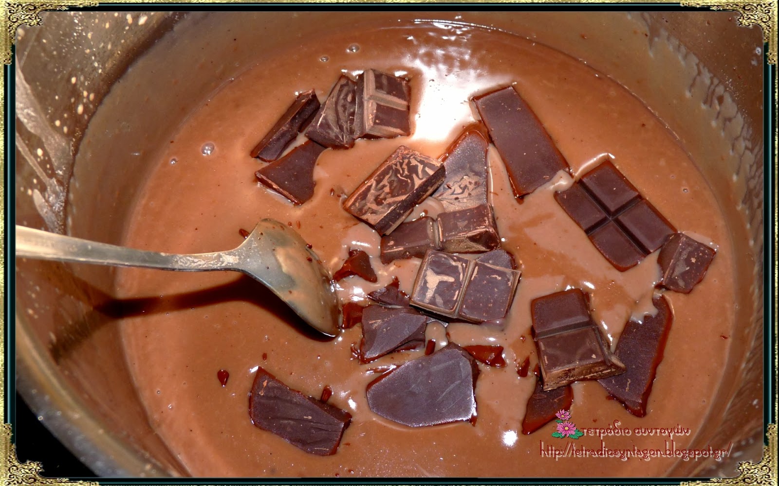 Όταν πήξει, βγάζουμε την κατσαρόλα από τη φωτιά και ρίχνουμε μέσα την σοκολάτα κουβερτούρα σπασμένη σε κομμάτια. Ανακατεύουμε σιγά σιγά μέχρι να λιώσει.