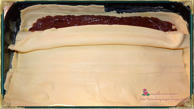 Βουτυρώνουμε ένα μέτριο ταψάκι και βάζουμε το ένα φύλλο σφολιάτας. Ρίχνουμε την κρέμα από πάνω και την απλώνουμε ομοιόμορφα.